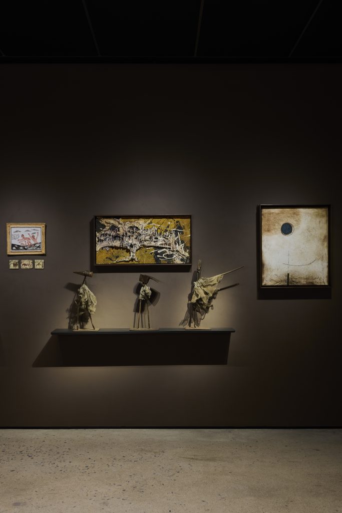 “Three Graces”, a trio of playful sculptures by Carlo Gamberini, sees the artist taking old bronze-work tools from his family foundry, the Vignali Foundry in Pretoria, and crafting them into small, dancing figures. Each one sits here, liberated from the foundry floor, personified and full of life. Certainly, the tools are still “working” — an oil and sand painting by Hannes Harrs sitting to the right of the dancing sculptures carries what almost looks like an incidental mark from the leg of one figure.