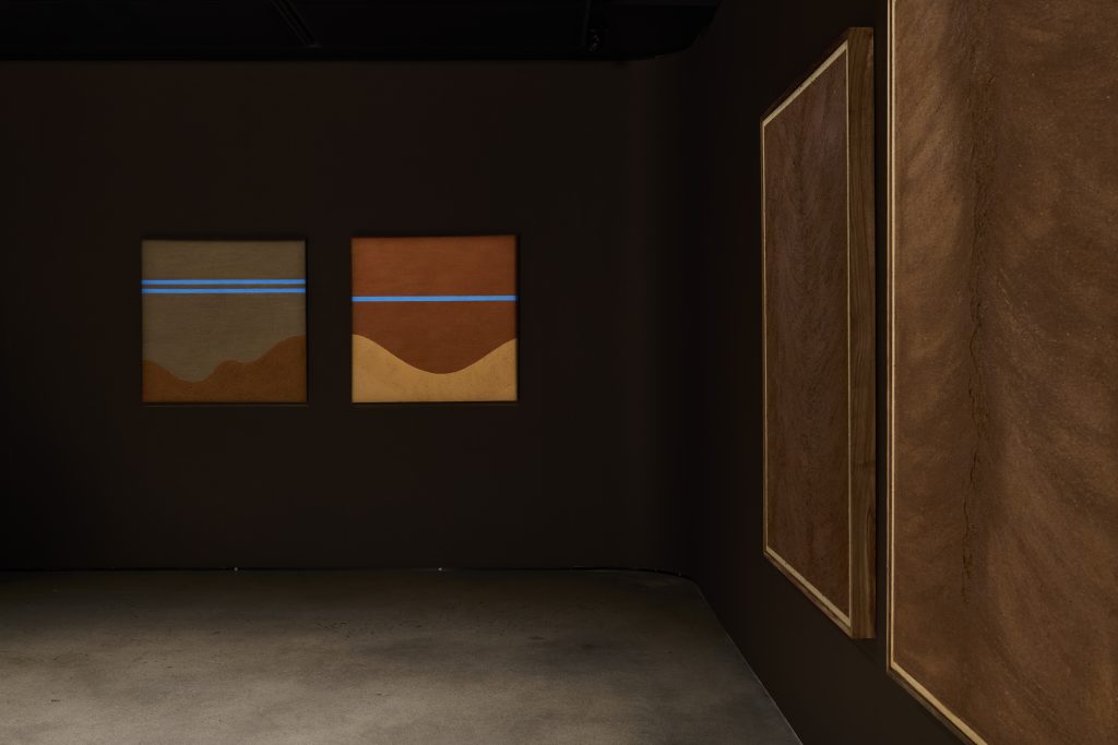 Engaged in quiet conversation with Nel’s works are the large and luminous works of Seretse Moletsane. They are hand-painted with sifted soil and cow dung and imbued with blue pigment to various extents. Five of Moletsane’s paintings occupy the back corner of the gallery. Some have a clear blue line running through them — a horizon line, a waterline — while the others are like aerial landscapes, full of movement and the artist’s gestures. In the latter, painting becomes an intuitive, corporeal act for Moletsane. Depending on how you see the work, what emerges is a furrow, or a cowhide. Either way, there is earth, land, and a sense of home.